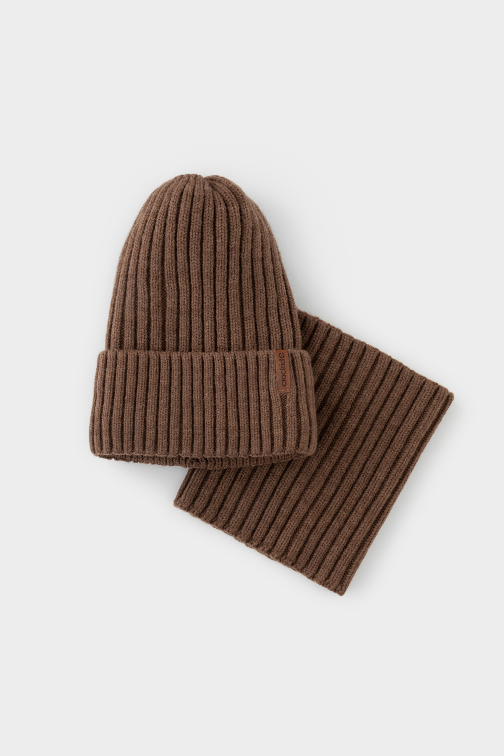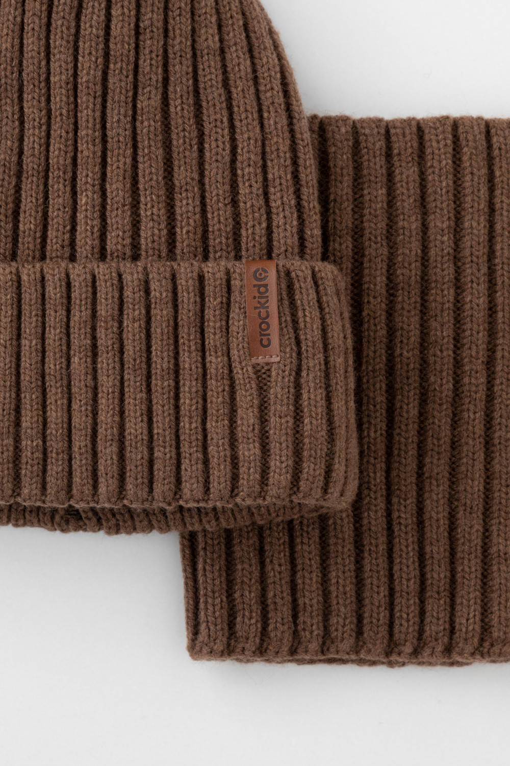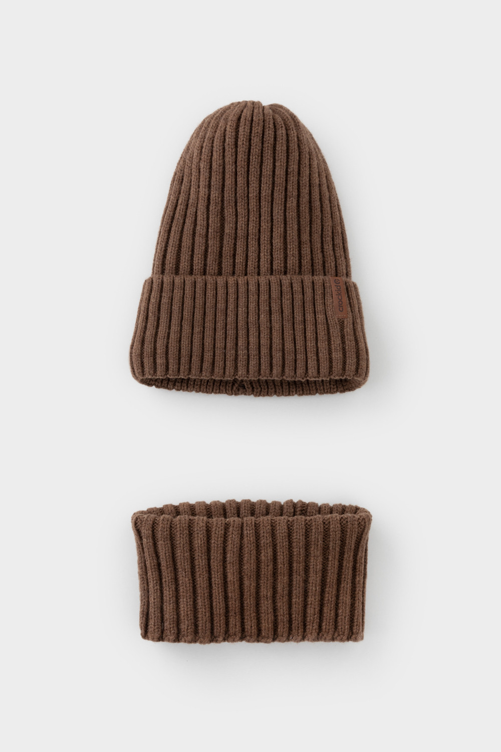 Комплект детский: шапка и снуд из полушерсти. Тёплая вязаная шапка с отворотом на подкладе из флиса. Украшена нашивкой из искусственной кожи. Узкий снуд без оборотов вокруг шеи. Изделие сохраняет форму и стойкий цвет после многочисленных стирок.