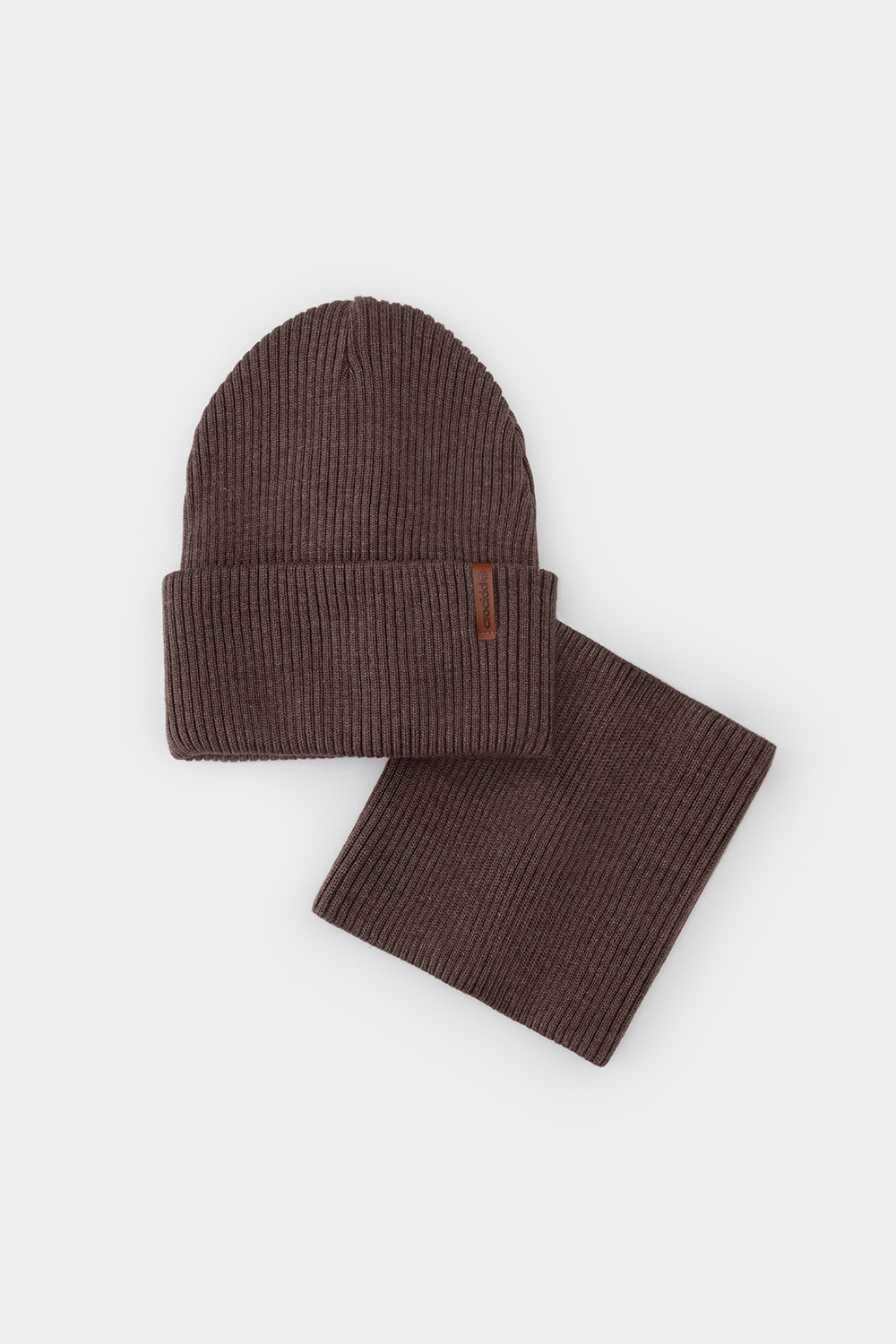 Комплект демисезонный из шапки с отворотом и снуда. Связан из высококачественного хлопка и выполнен переплетением ластик. Комфортно прилегает, обеспечивая защиту от холода и хороший теплообмен. Изделия хорошо переносят многократные стирки, сохраняя цвет и форму.