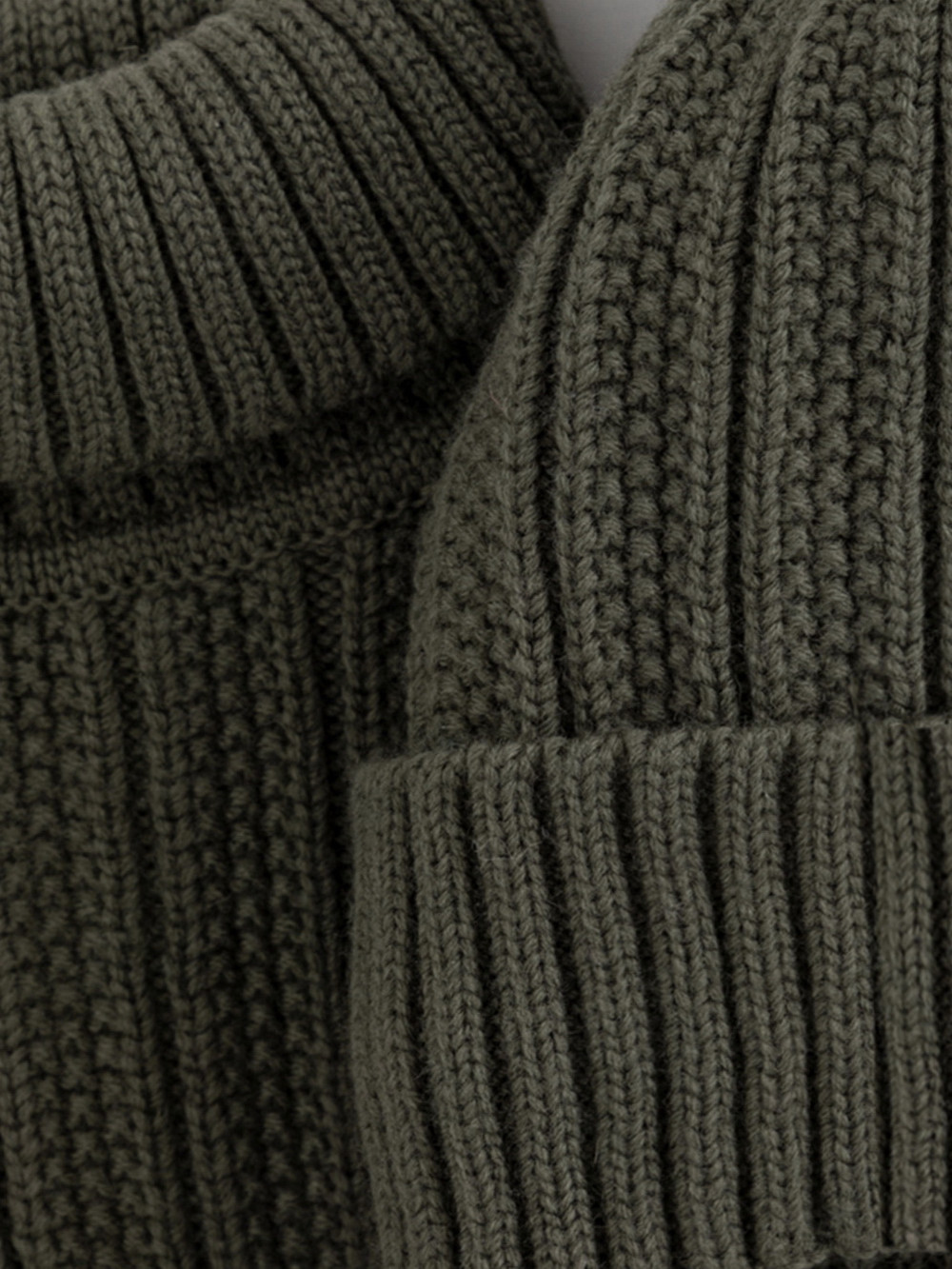 Комплект для мальчика: шапка и манишка из полушерстяной пряжи. Шапка на завязках с синтепоновым утеплителем. Подклад из натурального хлопка. Полностью закрывает голову, уши и шею, защищая ребёнка от холодного воздуха и ветра. На макушке помпон. Манишка с высоким воротником с эластичным отворотом.