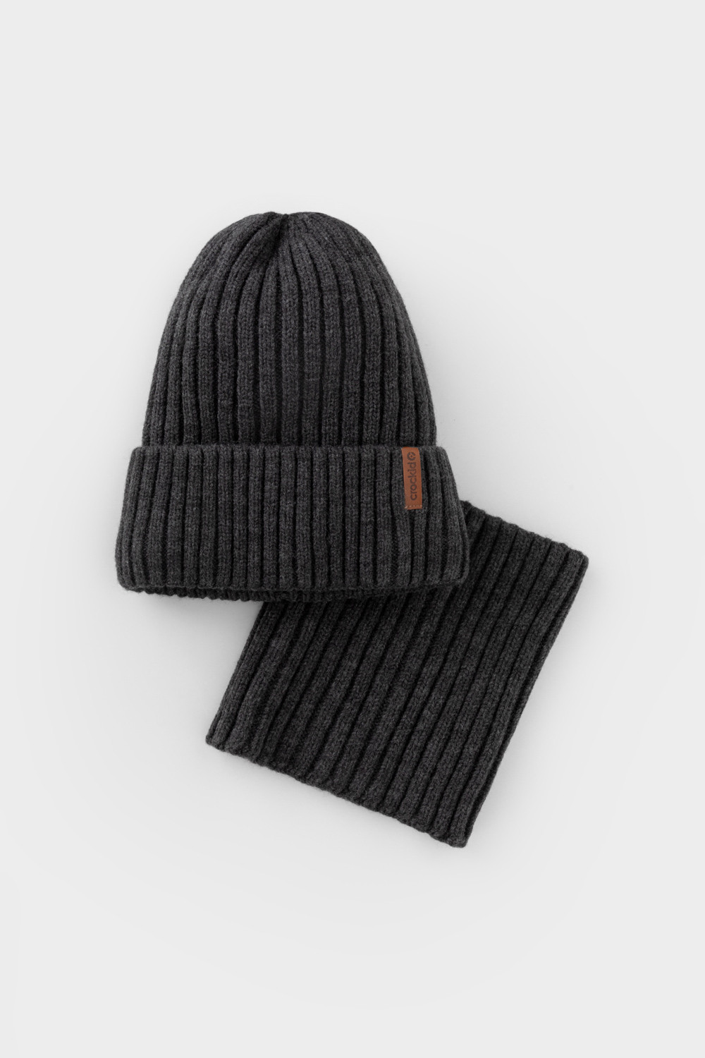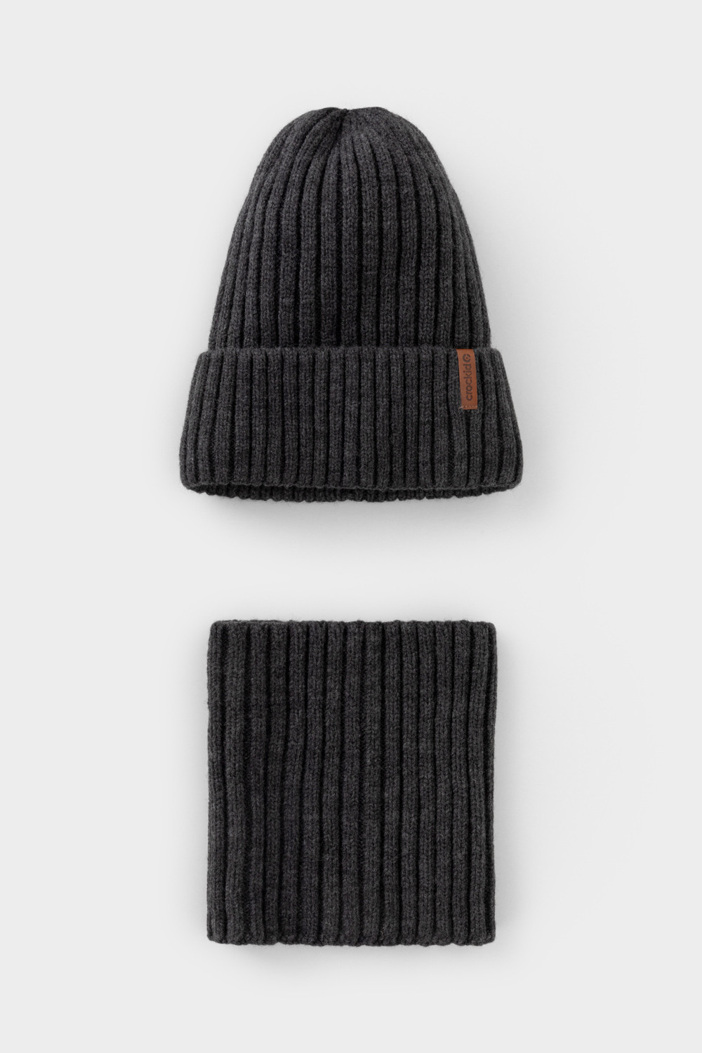 Комплект зимний детский: шапка и снуд из полушерсти. Тёплая вязаная шапка с отворотом на подкладе из флиса. Украшена нашивкой из искусственной кожи. Узкий снуд без оборотов вокруг шеи. Изделие сохраняет форму и стойкий цвет после многочисленных стирок.