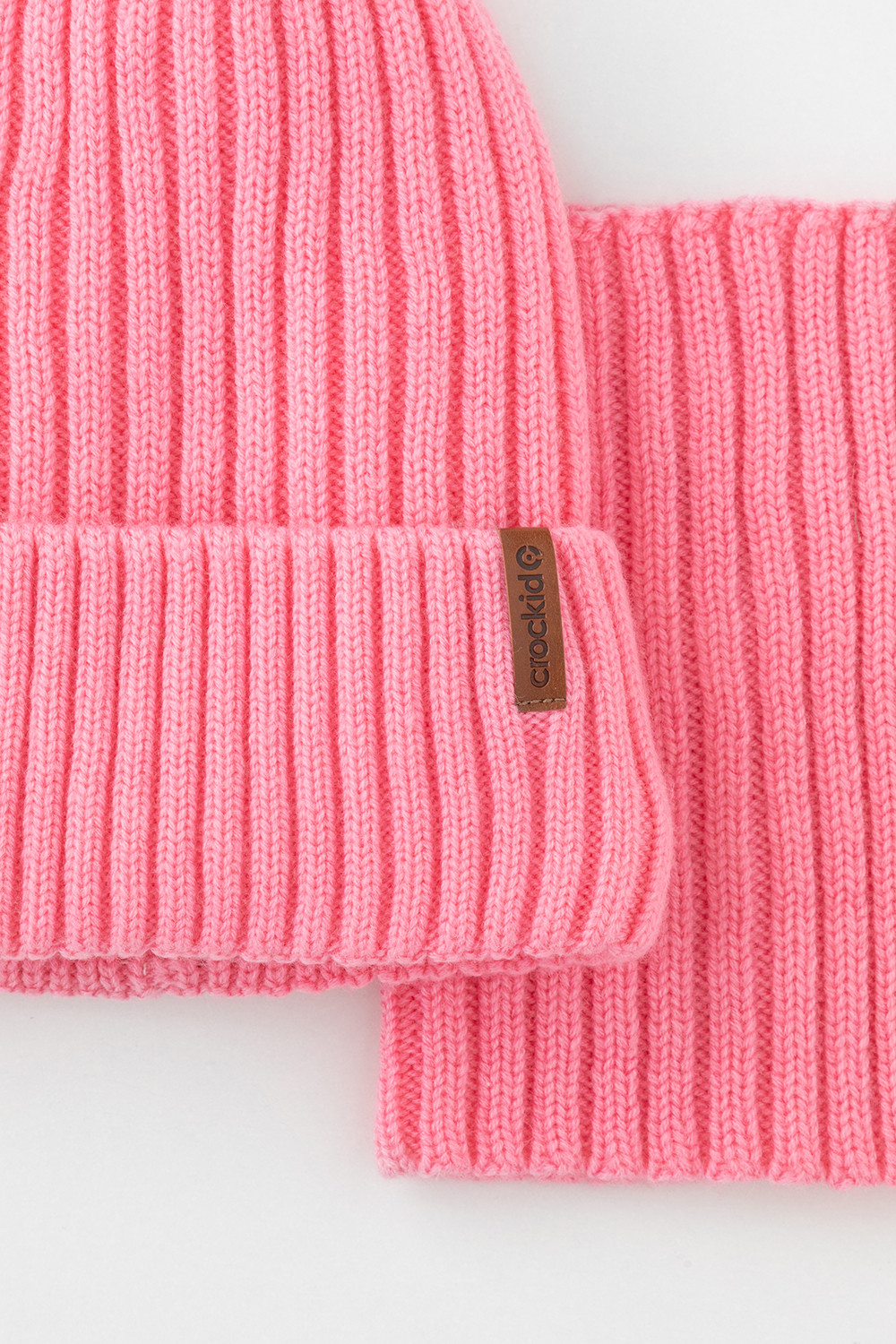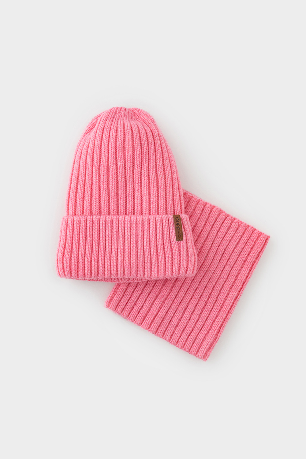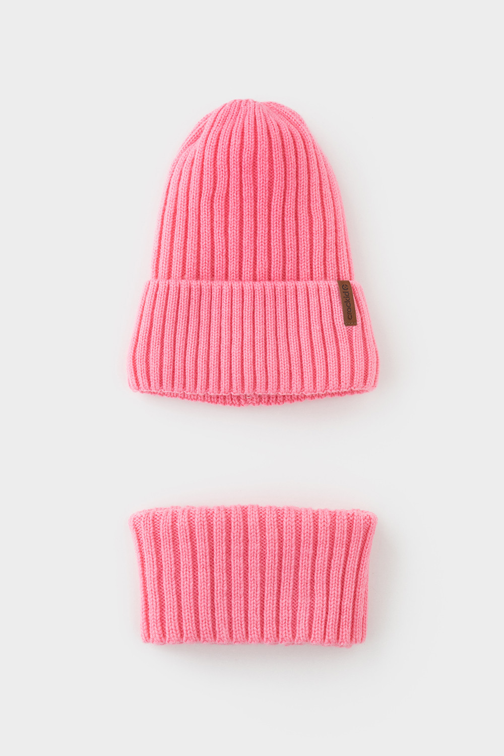 Комплект детский: шапка и снуд из полушерсти. Тёплая вязаная шапка с отворотом на подкладе из флиса. Украшена нашивкой из искусственной кожи. Узкий снуд без оборотов вокруг шеи. Изделие сохраняет форму и стойкий цвет после многочисленных стирок.