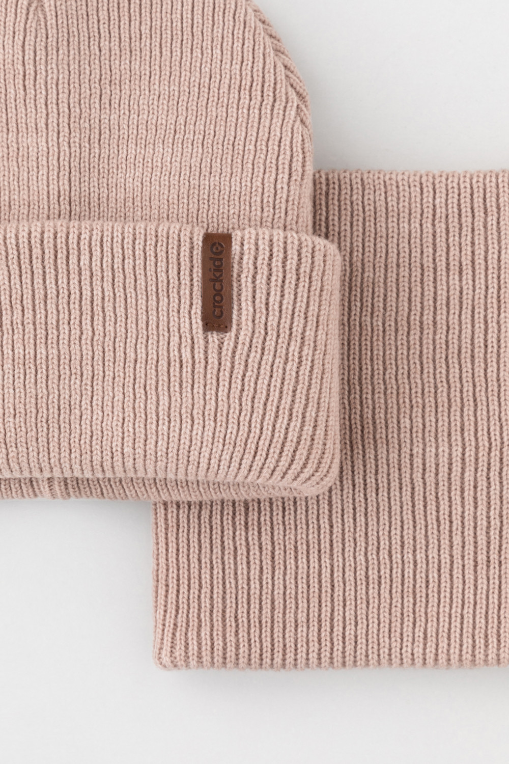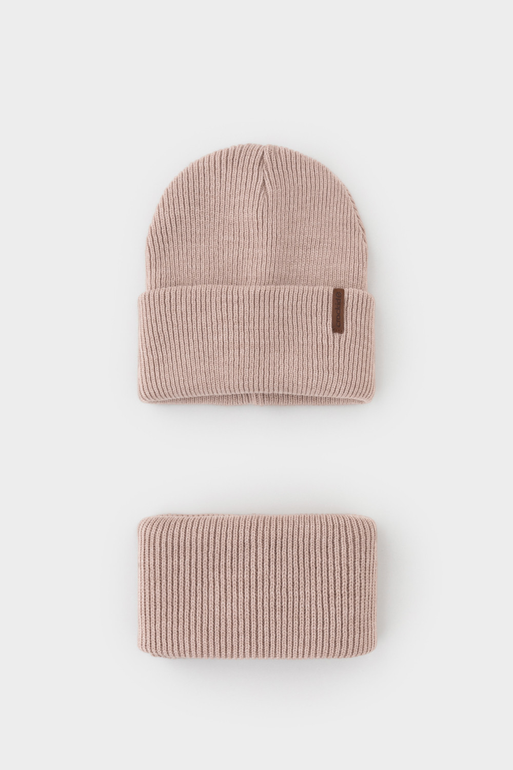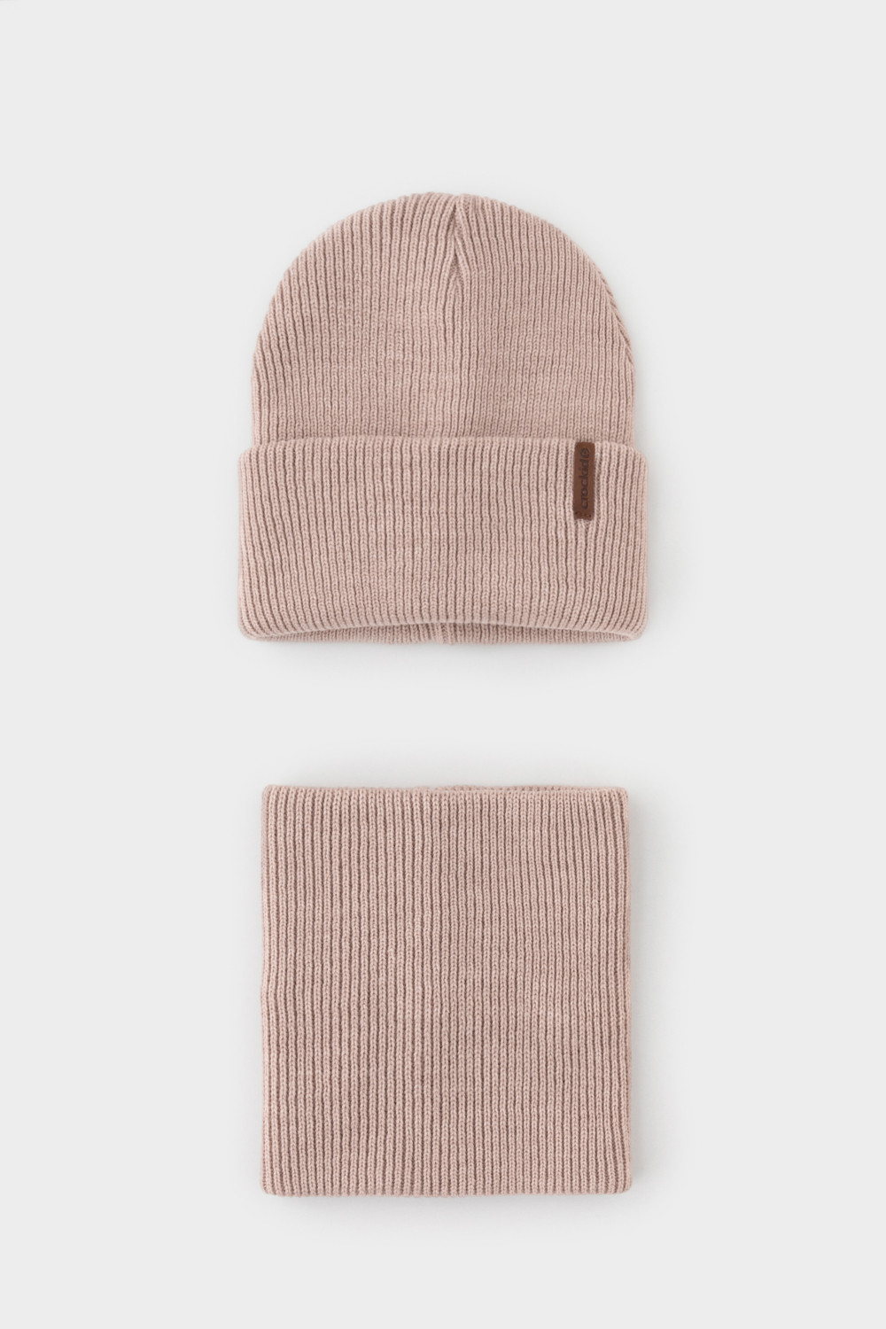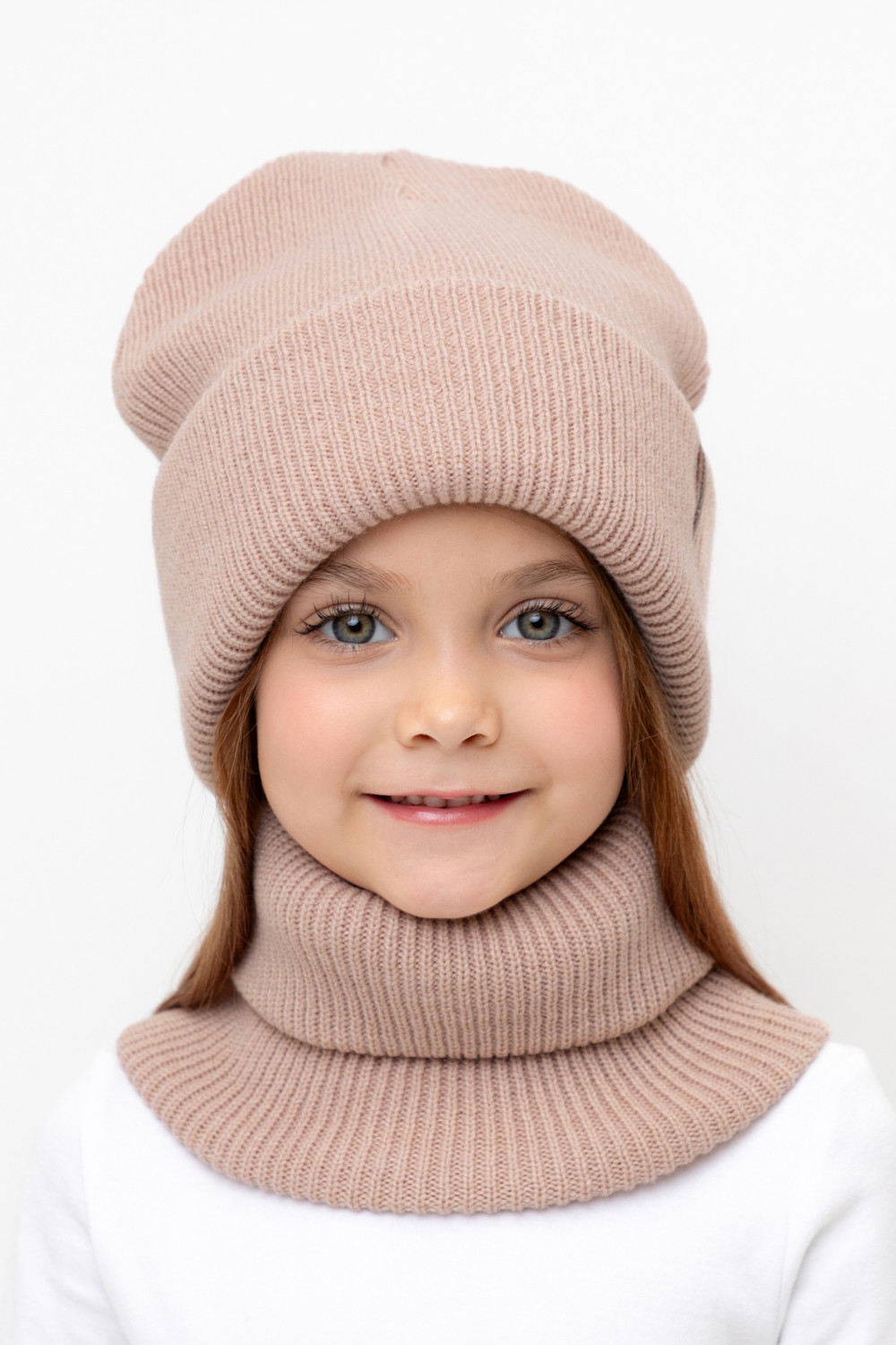 Комплект детский: шапка и снуд из полушерсти. Тёплая шапка с отворотом, украшена нашивкой из искусственной кожи. Снуд без оборотов вокруг шеи. Изделие сохраняет форму и стойкий цвет после многочисленных стирок.