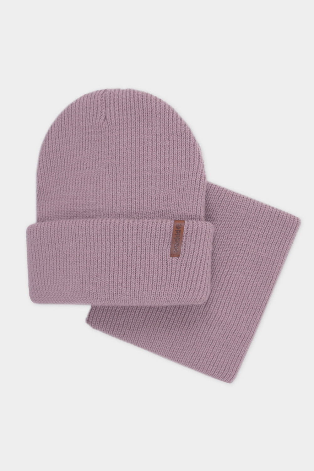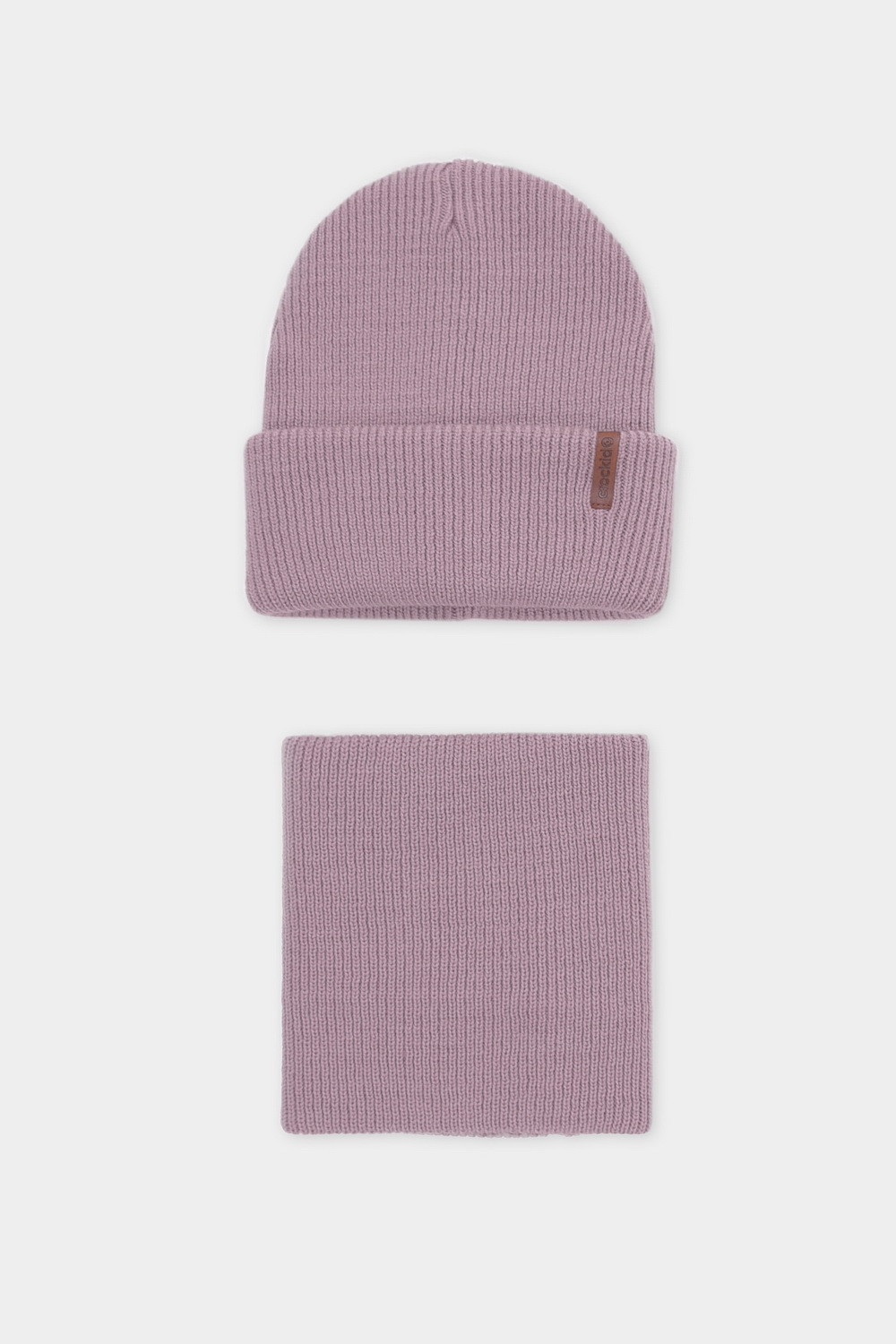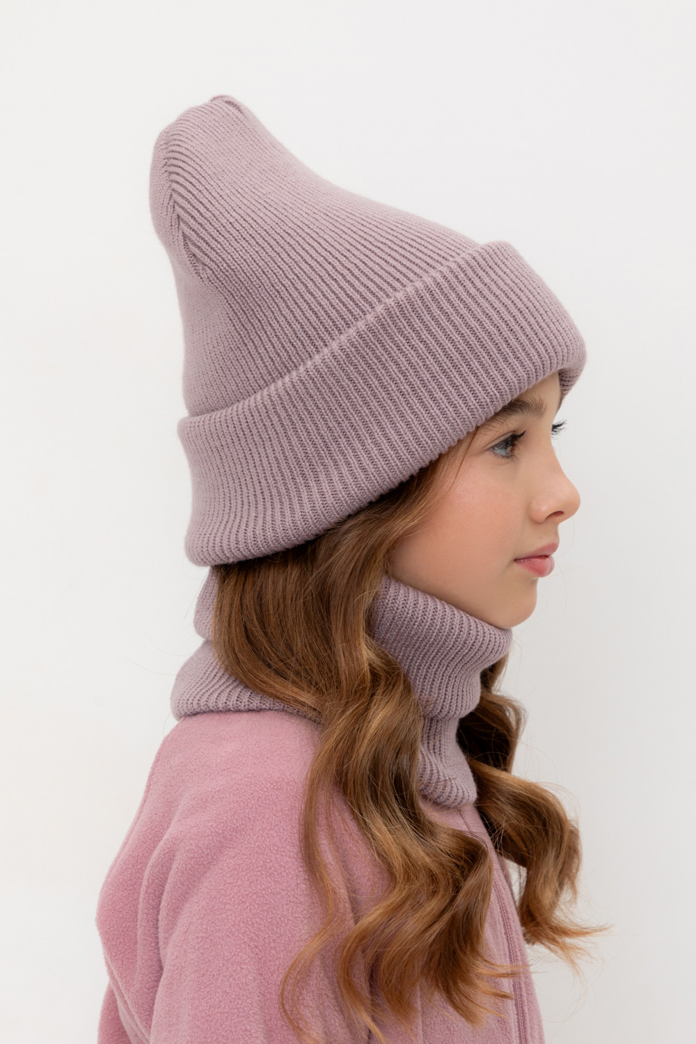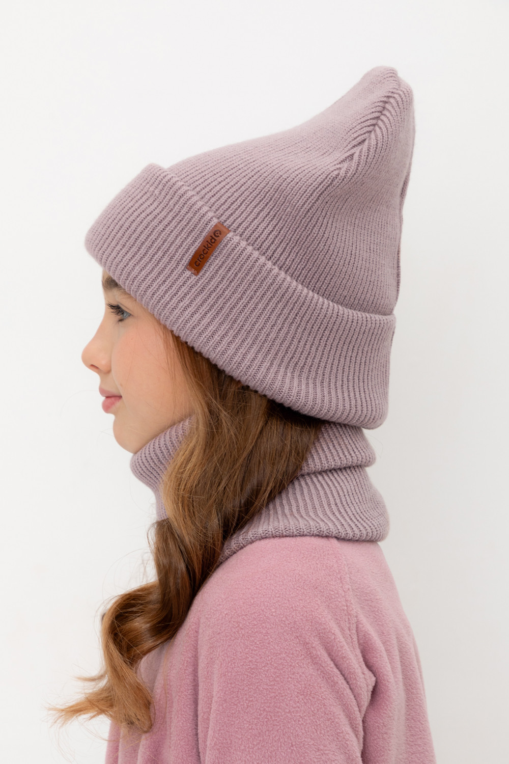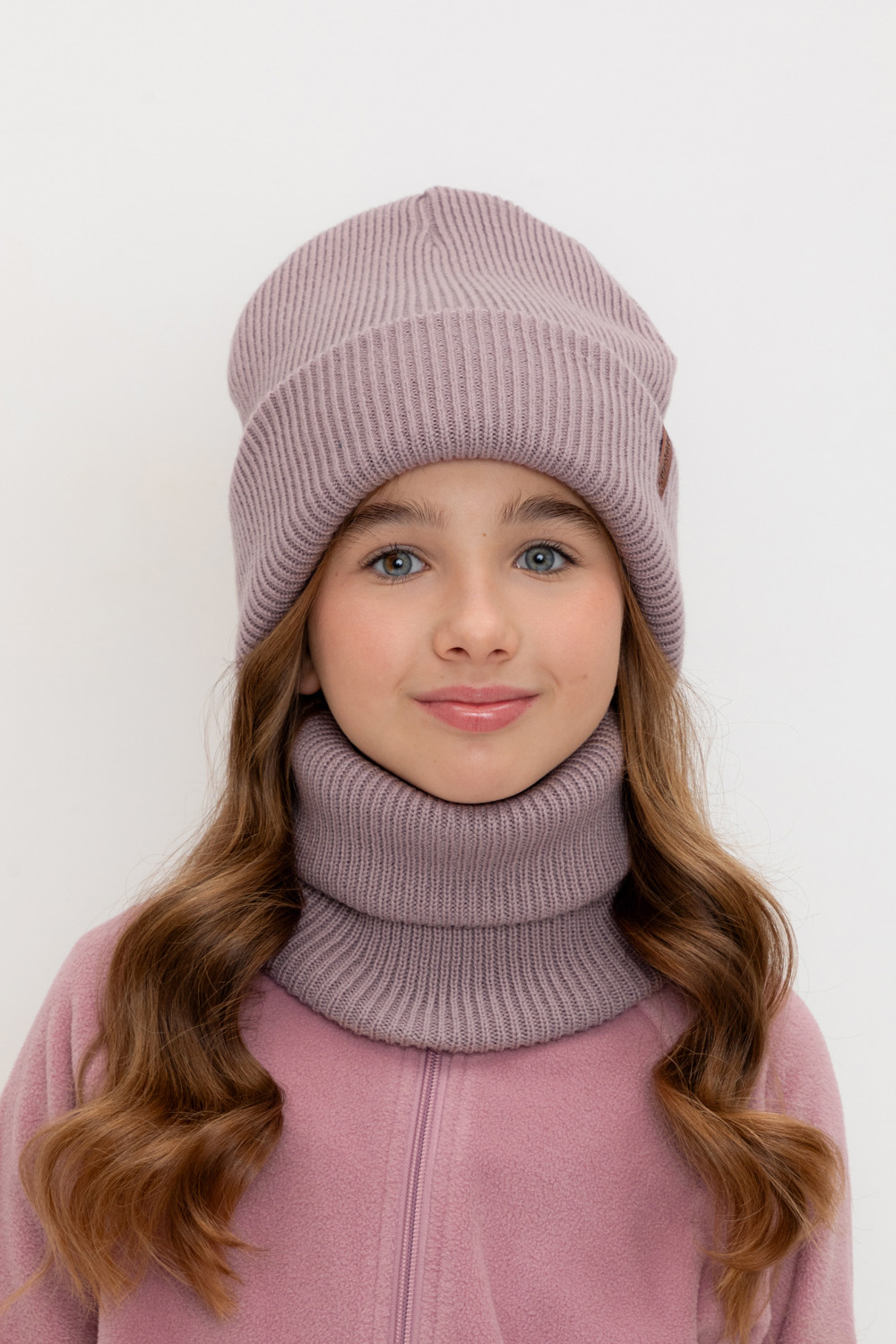 Комплект детский: шапка и снуд из полушерсти. Тёплая шапка с отворотом, украшена нашивкой из искусственной кожи. Снуд без оборотов вокруг шеи. Изделие сохраняет форму и стойкий цвет после многочисленных стирок.