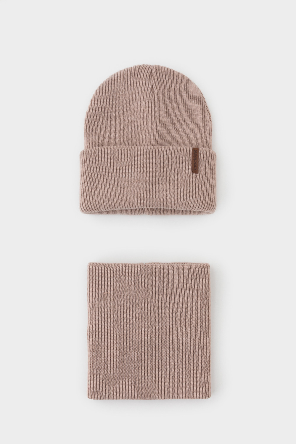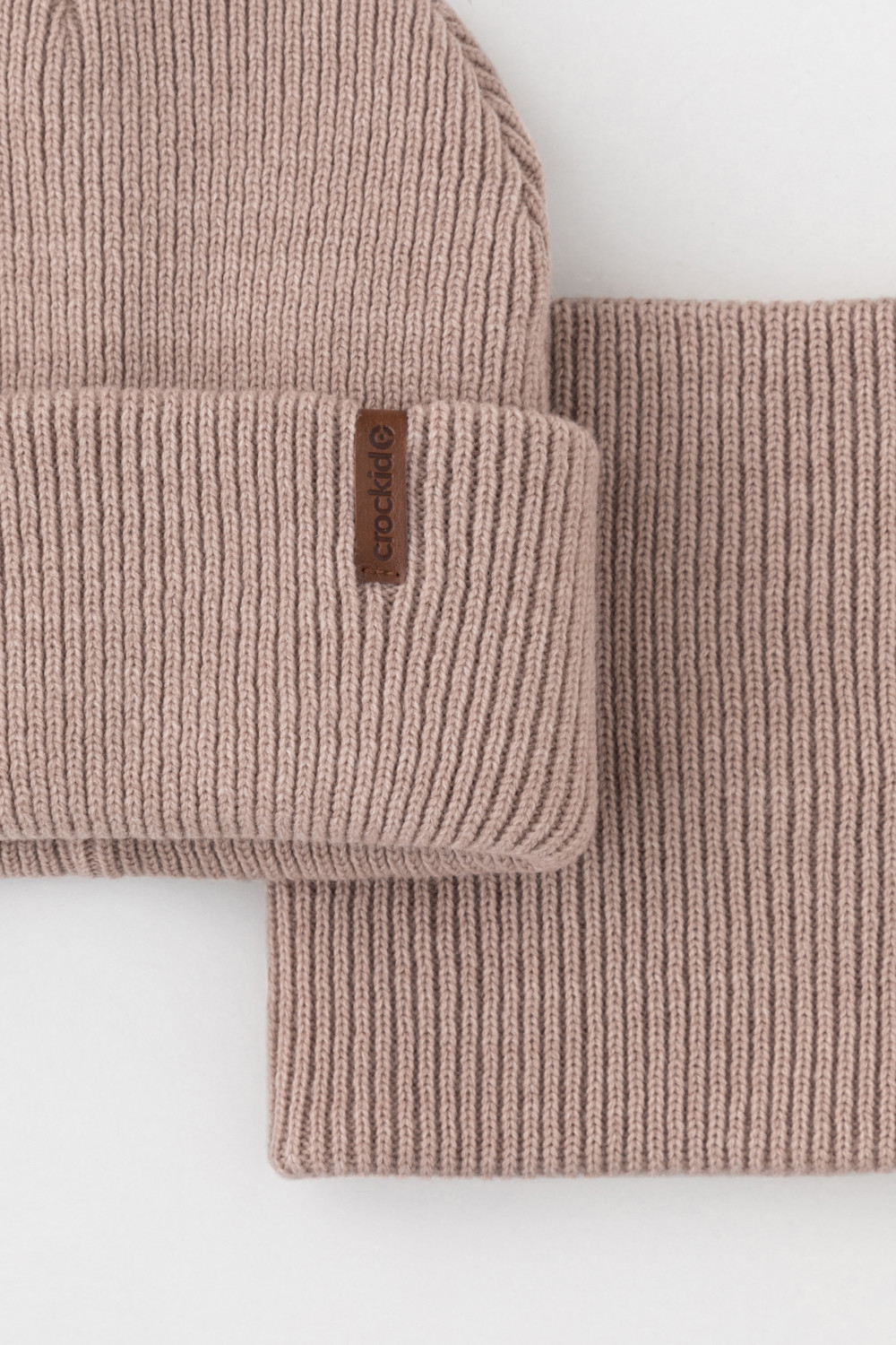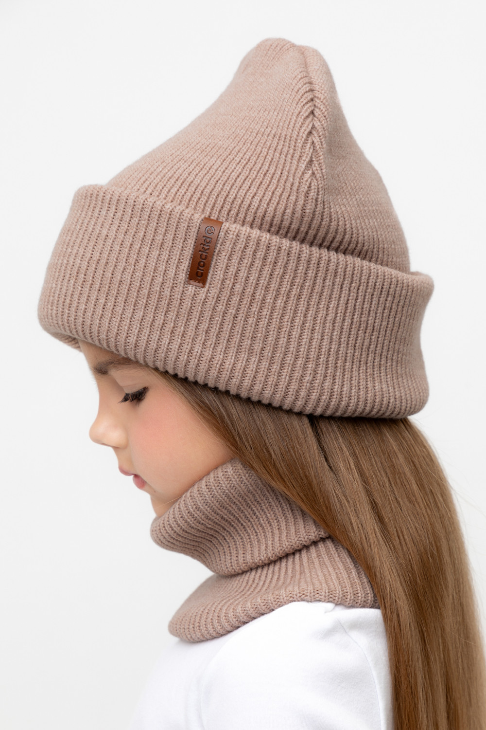 Комплект детский: шапка и снуд из полушерсти. Тёплая шапка с отворотом, украшена нашивкой из искусственной кожи. Снуд без оборотов вокруг шеи. Изделие сохраняет форму и стойкий цвет после многочисленных стирок.