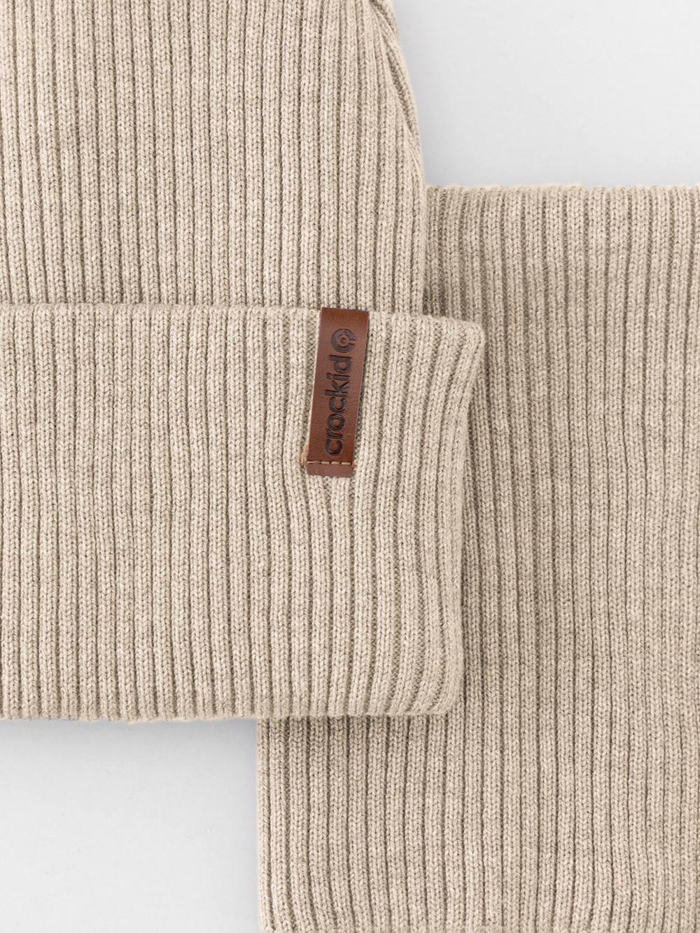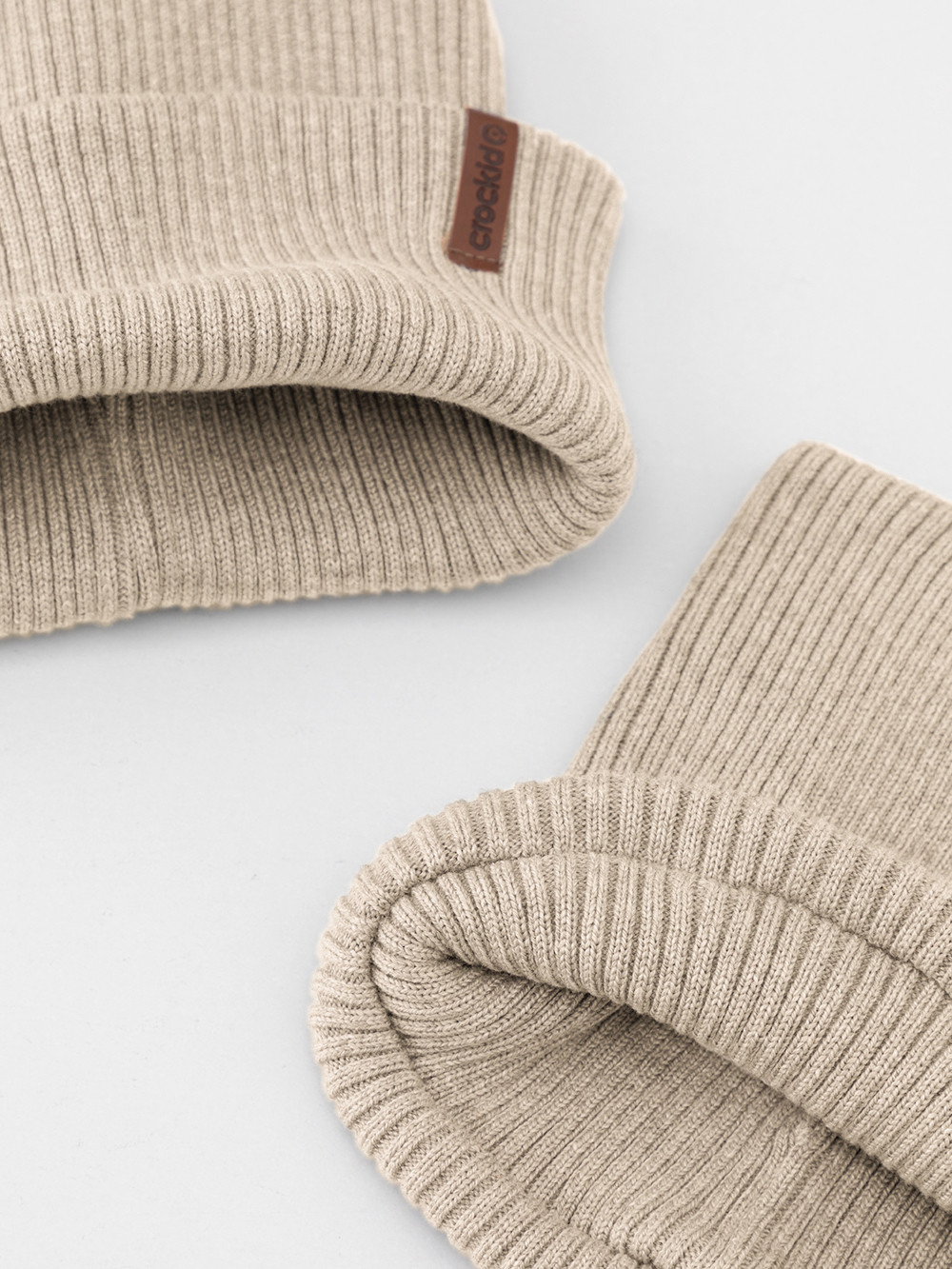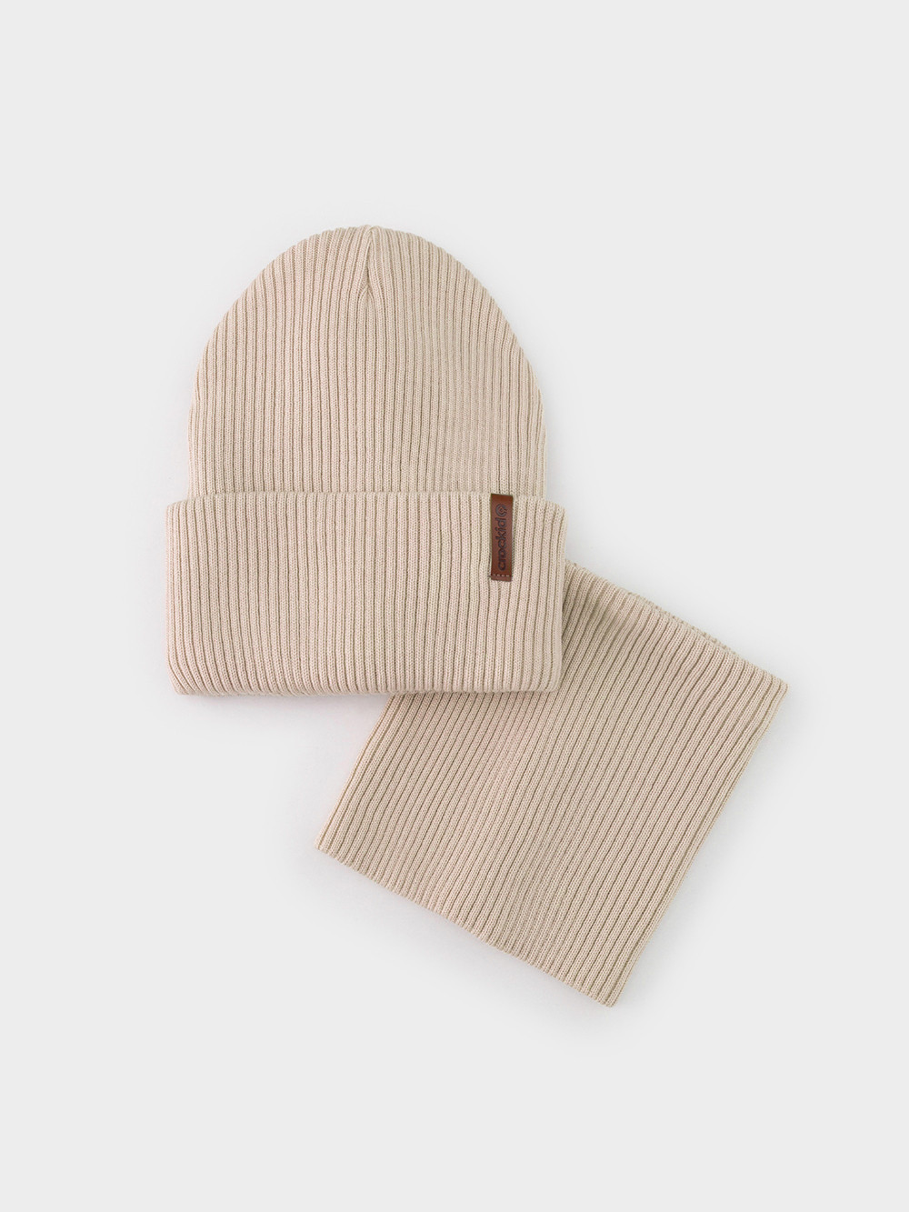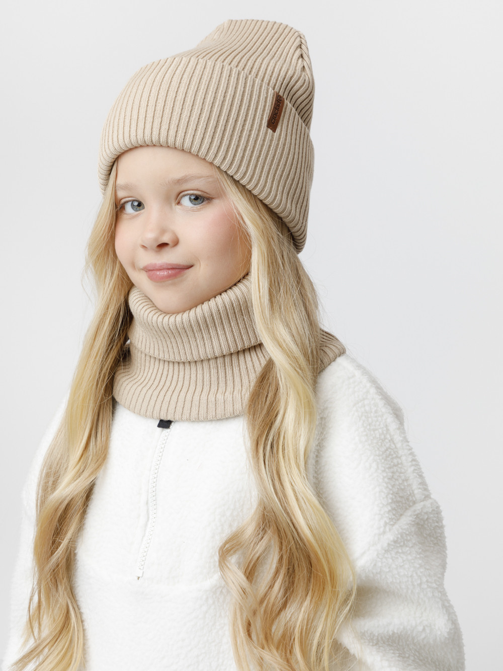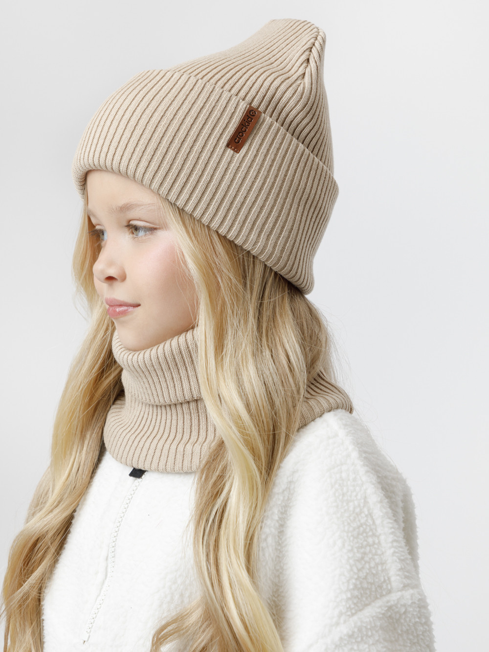 Комплект демисезонный из шапки с отворотом и снуда. Связан из высококачественного хлопка и выполнен переплетением ластик. Комфортно прилегает, обеспечивая защиту от холода и хороший теплообмен. Изделия хорошо переносят многократные стирки, сохраняя цвет и форму.