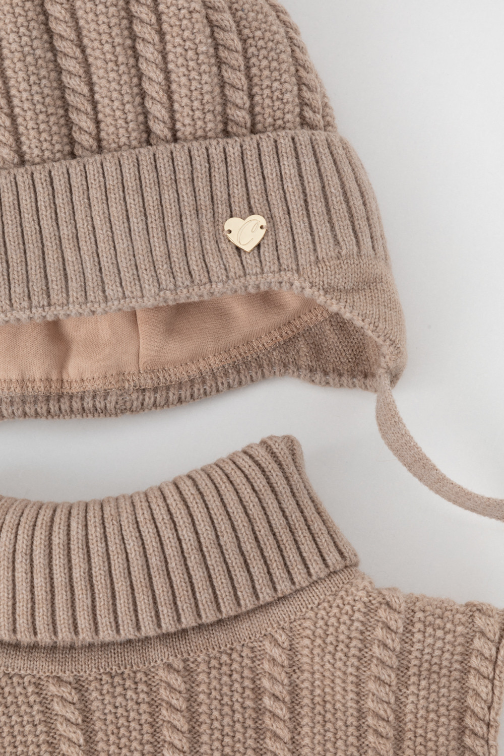 Комплект для девочки: шапка и манишка из полушерстяной пряжи. Шапка на завязках с синтепоновым утеплителем. Подклад из натурального хлопка. Полностью закрывает голову, уши и шею, защищая ребёнка от холодного воздуха и ветра. На макушке помпон. Манишка с высоким воротником с эластичным отворотом.