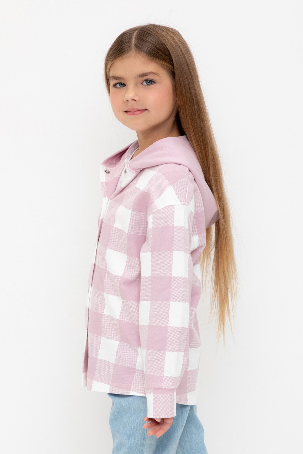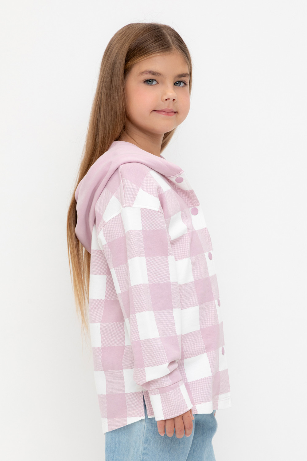 Свободная трикотажная рубашка для девочки с капюшоном. Выполнена из мягкого петельчатого футера. Застёгивается на кнопки. Модель с закругленным низом и спущенным плечом. По бокам разрезы.